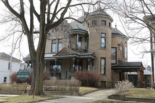 The Victorian mansion features decorative glass and rich carvings in cherry and oak.