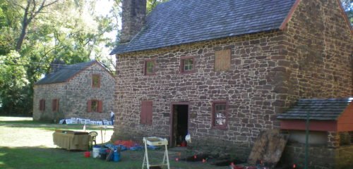 Four early stone houses set on the Schuylkill River, the oldest structure in Berks County (Mouns Jones, ca. 1716), the George Douglass Mansion (ca. 1763, unrestored), the modest Bridge Keeper’s House and the restored White Horse Tavern, ca. 1727/1762.